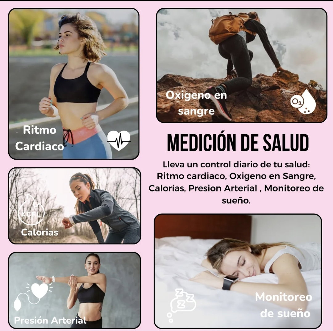 -Monitorea tu salud: Ritmo cardĂaco, presiĂłn arterial, oxĂgeno en sangre y sueño.