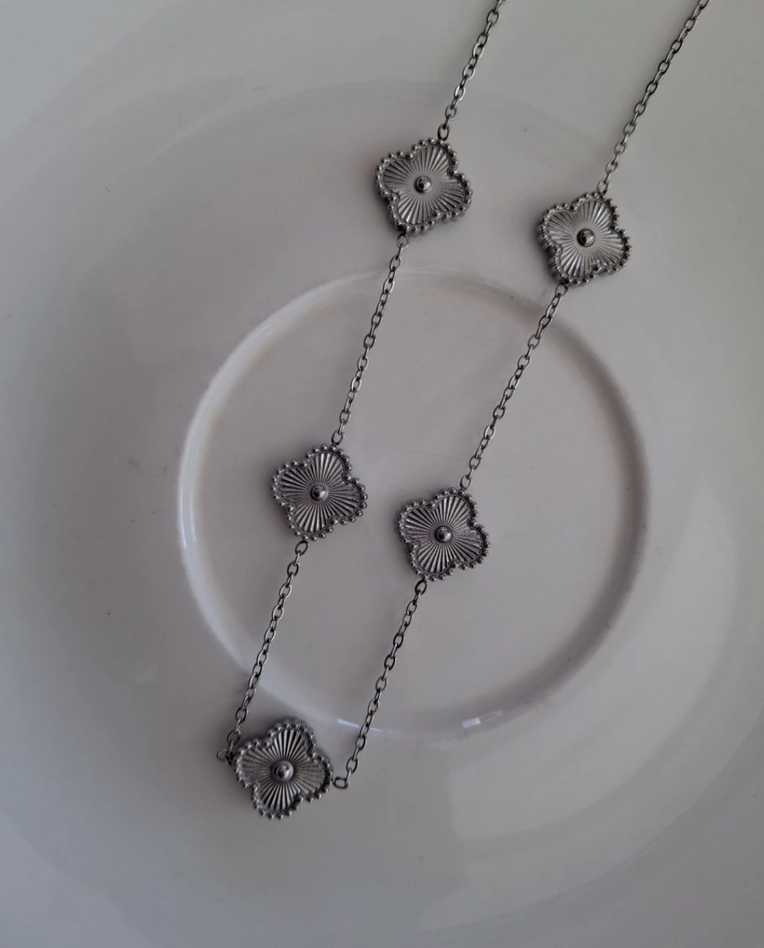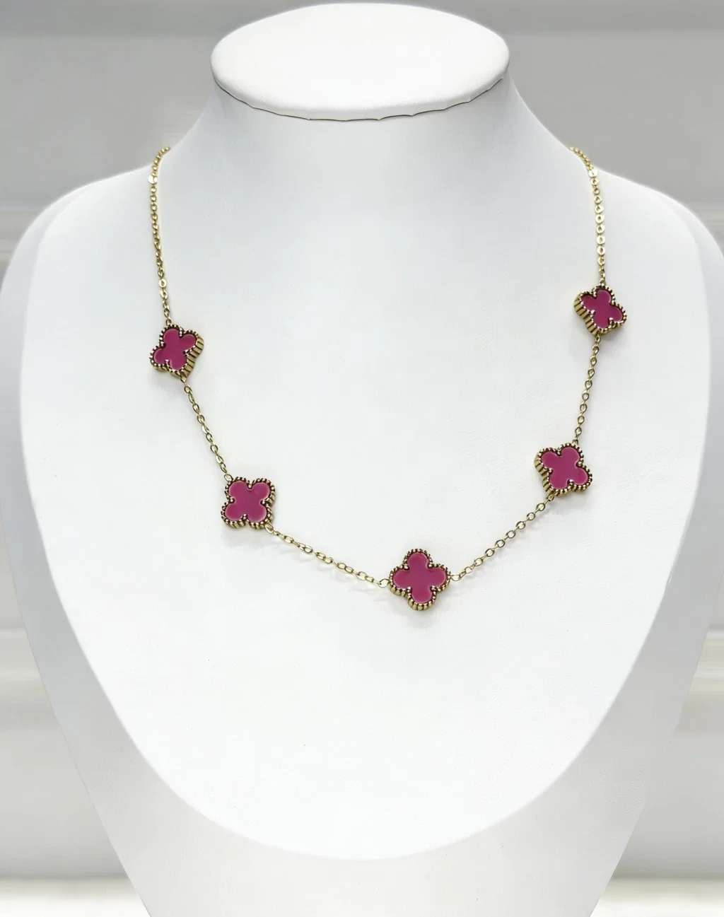 Cinco deseos, una esencia. Este collar celebra la buena suerte, la abundancia y la protección con cinco delicados tréboles en acero dorado, creando una joya que brilla con intención y estilo.