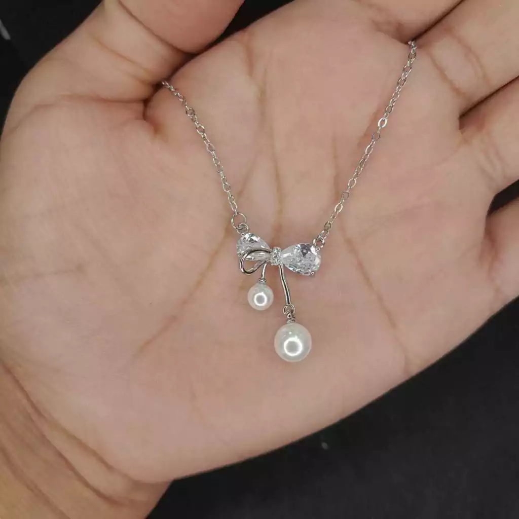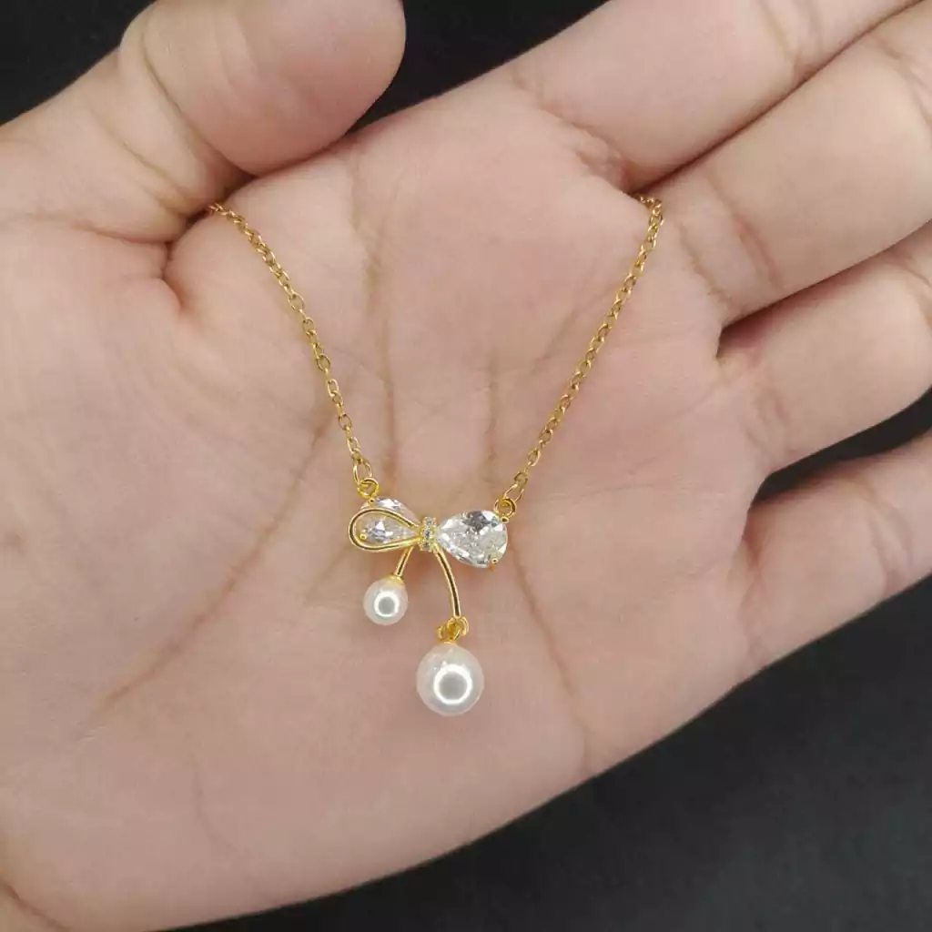 Un lazo de elegancia. Este collar combina la ternura de un moño con el brillo sutil de strass y la delicadeza de una perla, creando una joya que transmite dulzura, estilo y sofisticación.