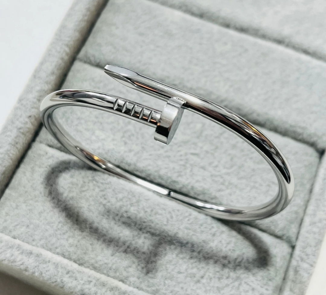 Estilo industrial con elegancia. Esta pulsera tipo clavo en acero quirúrgico plateado es una pieza audaz, moderna y resistente, perfecta para quienes marcan tendencia con actitud.