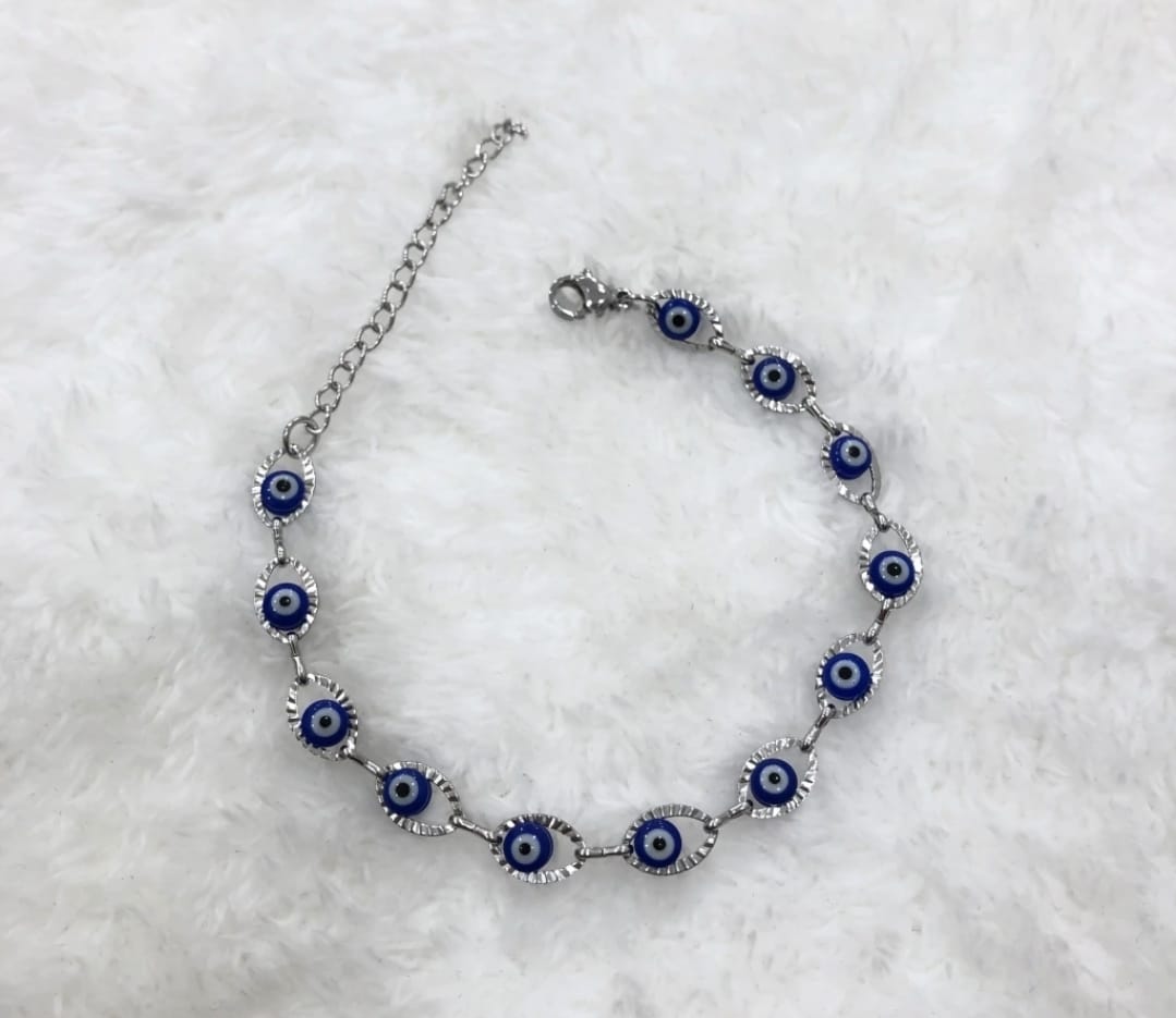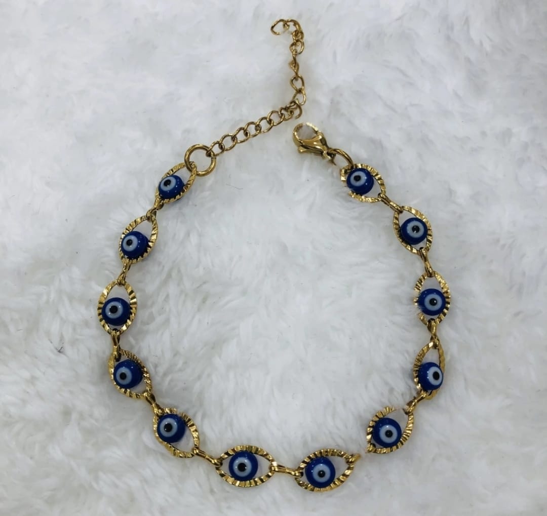 Protección con estilo. Esta pulsera combina el poder simbólico del ojo protector con el brillo elegante del acero en tonos dorado y plateado, creando una pieza moderna, mística y versátil.