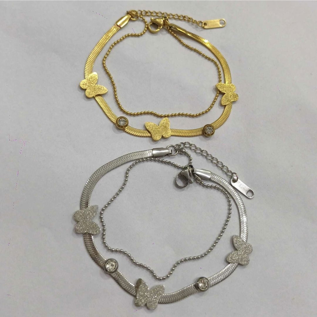 🦋 Pulsera de Acero Quirúrgico con Dijes de Mariposas y Strass