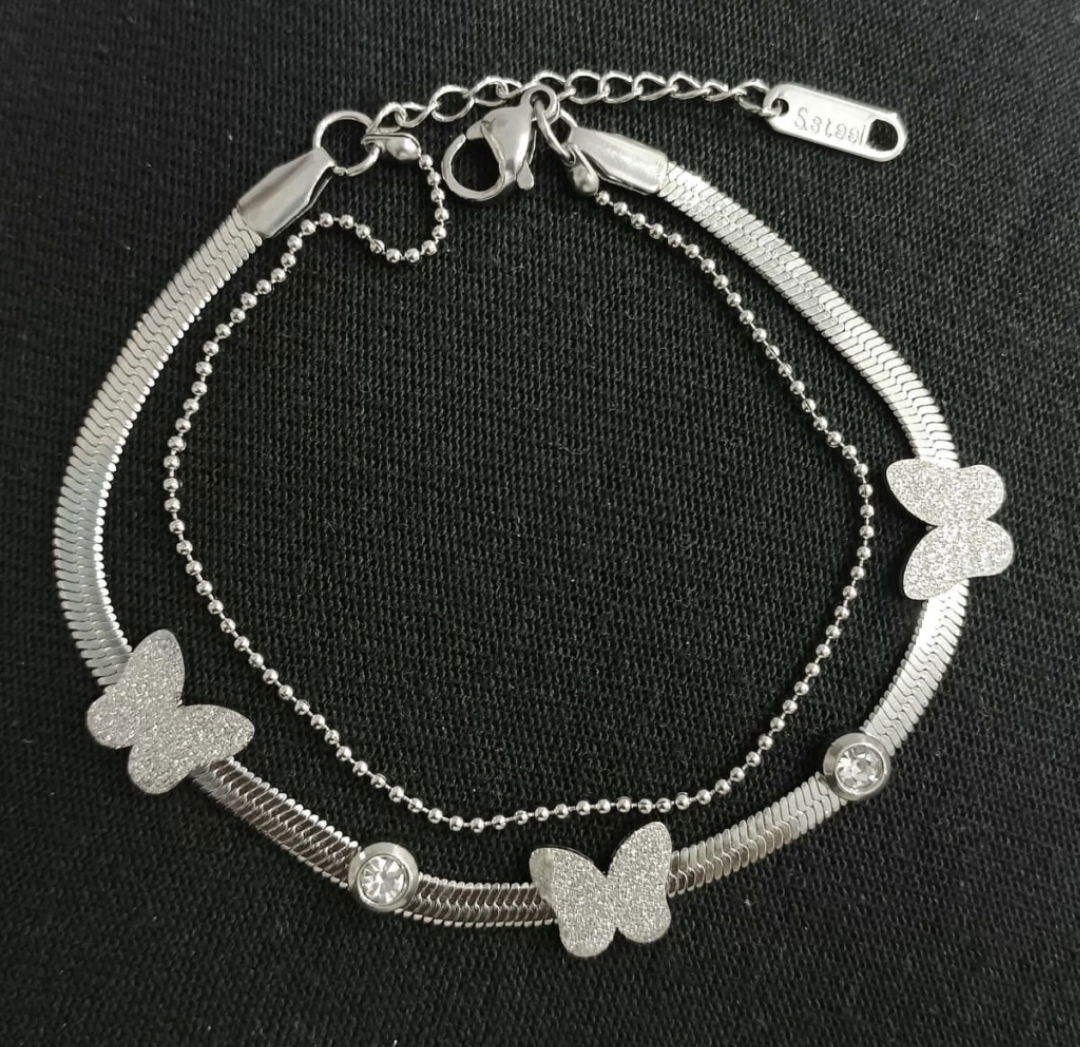 Brillá con libertad. Esta pulsera combina la resistencia del acero quirúrgico con la delicadeza de mariposas y el brillo sutil de strass, creando una joya que simboliza transformación, belleza y luz interior.