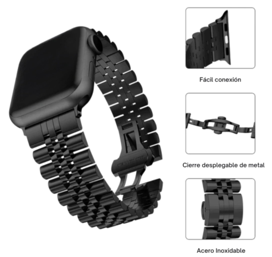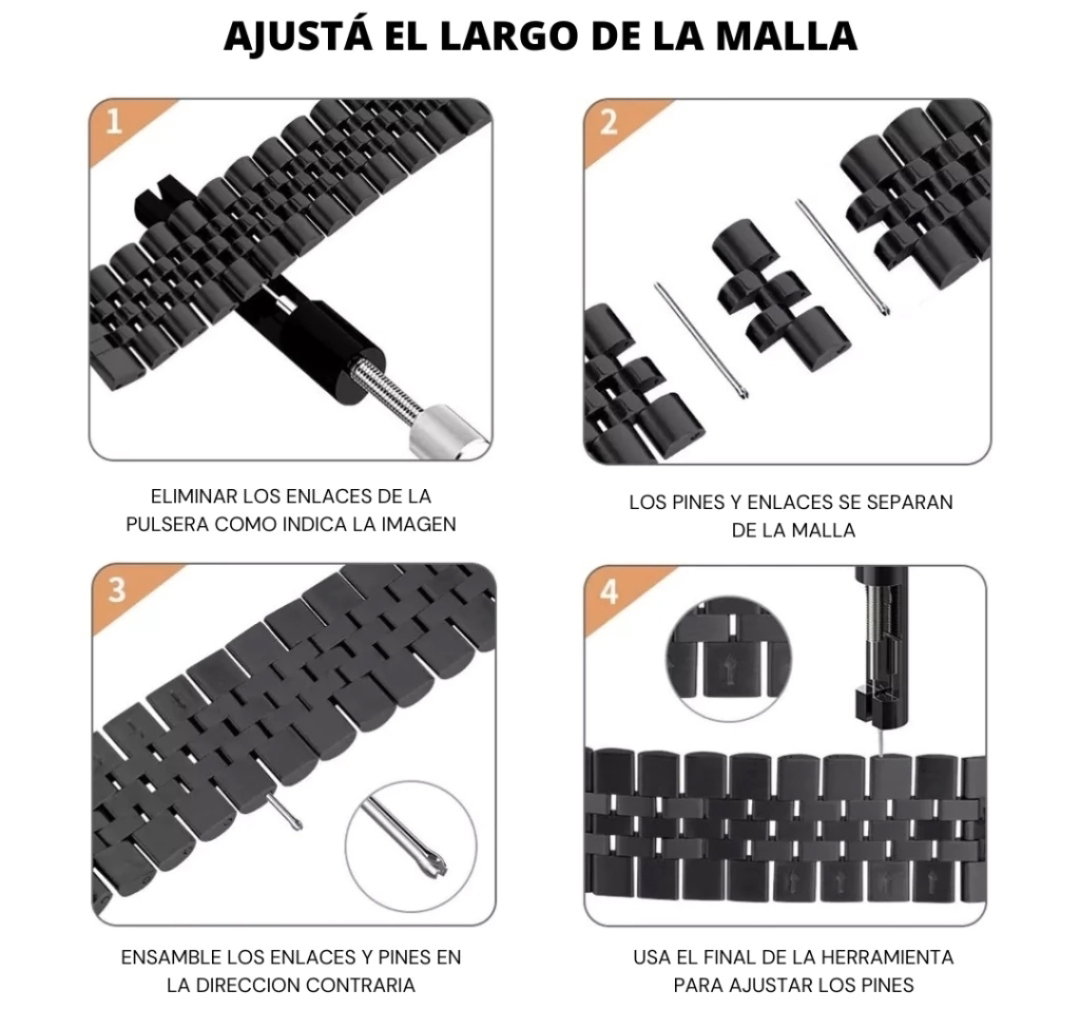 ✅ Ajustable: Incluye herramienta para remover eslabones y lograr el calce perfecto. Puede ajustarse entre 15 a 21 cm.
