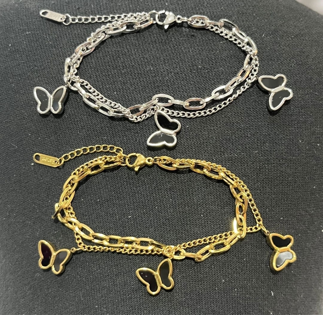 Elegancia que renace. Esta pulsera combina la fuerza del acero quirúrgico con el misterio de una mariposa negra, creando una pieza delicada, resistente y cargada de significado.