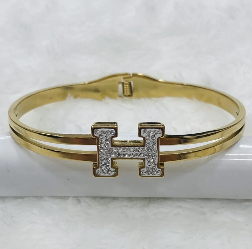 Elegancia que impone. Esta esclava rígida en acero dorado con diseño H y detalles en strass es una pieza icónica que combina lujo, estilo y resistencia. Ideal para quienes buscan una joya con presencia y brillo sutil.