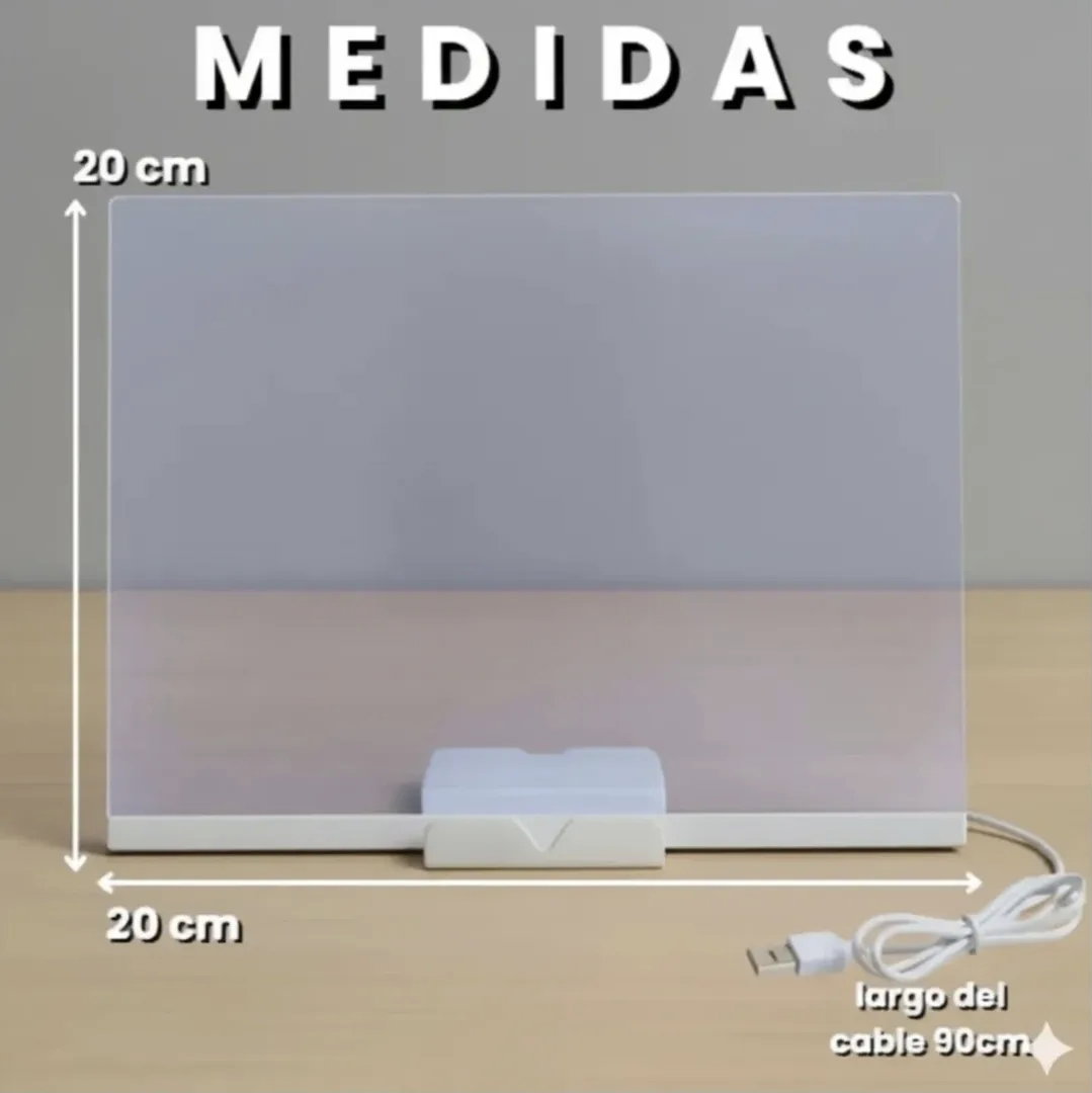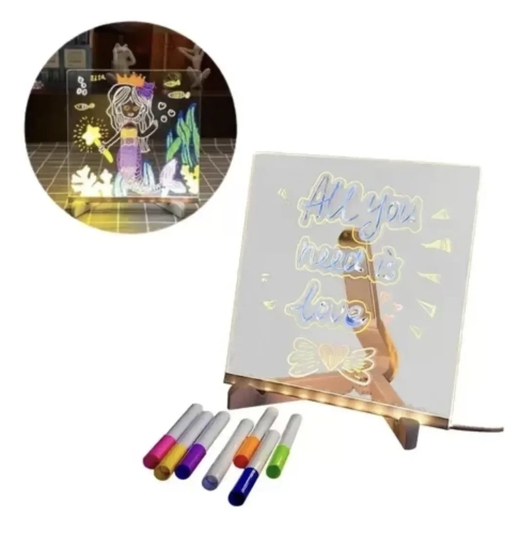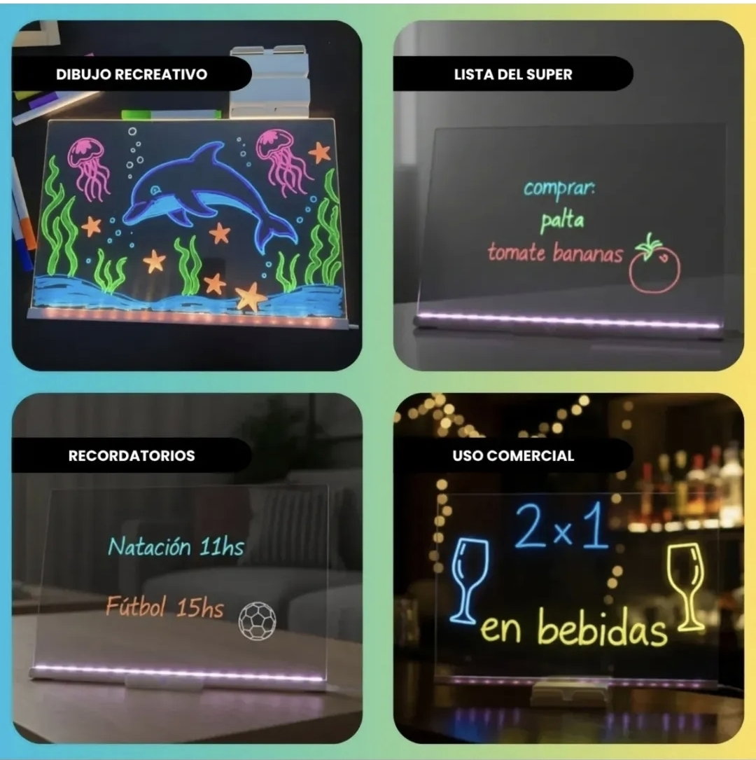 Transforma tus mensajes en obras brillantes. Esta pizarra acrĂlica con iluminaciĂłn LED es ideal para decorar, comunicar o sorprender en cualquier espacio. Su diseño compacto y moderno permite escribir con fibrones especiales y ver cĂłmo tus palabras e ilustraciones cobran vida con luz.